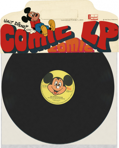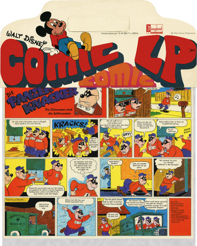 Zwei dieser Ausgaben sind mit einer für LPs typischen Hülle aus Pappe (sog. Cover) ausgestattet. Sie sind hinsichtlich der Gestaltung der innen Schutzhülle (bedruckt mit Produktübersicht aller Comic-Hörspiele dieser Reihe + Coverabbildungen von 14 Disneyland-LPs [Goofy, 3:0 für die Bärte, Klein Adlerauge, Der Löwe ist los, Die drei kleinen Schweinchen, AristoCats, Ich Donald Duck, Susi und Strolch, Michy ist der Größte, Dschungel Buch, Peter Pan, Bambi, Winnie Puuh, Pinocchio]) und der Coverfront (Foto 1) identisch. Auch die Rückseite des Covers ist weitestgehend identisch, jedoch sind die Copyright- und technischen Hinweise am unteren Rand in beiden Fällen unterschiedlich formuliert, von unterschiedlichem Umfang und folglich anders gesetzt (Foto 2: Ausgabe mit kurzen Hinweisen; Foto 3: Ausgabe mit langen Hinweisen).